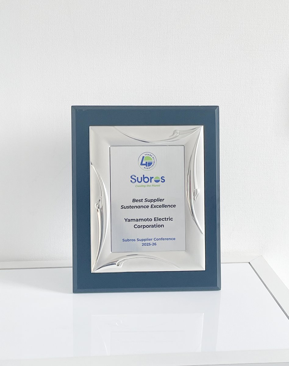 山本電気株式会社は、インドの自動車用エアコンメーカーであるSubros社より、「Best Supplier – Sustenance Excellence」をいただきました。 Subros社は1985年に設立され、今年40周年を迎えるインド最大の自動車用エアコンメーカー...